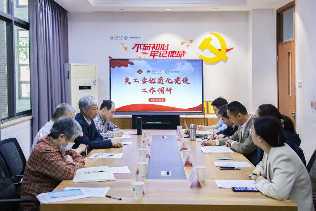 调研会上,耿向阳就校关工委长期以来对物联网工程学院关工委活动的大力支持及优质化建设的悉心指导表示感谢,表明学院党委历来高度重视关工委工作,力求做到“四个结合”,以“党建带关键”,形成同向育人合力。孔丽丹以《坚持四个“聚焦”推进关工委优质化建设》为题,汇报了学院党委推进关工委优质化建设均衡发展的情况,详细介绍了学院关工委在工作机制完善、教育体系构建、特色品牌培育、学生委员作为等方面开展的工作亮点,以及今后的工作思路与努力方向。吴锡生围绕《江南大学二级学院关工委优质化建设基本要求》逐项汇报了工作达标情况。