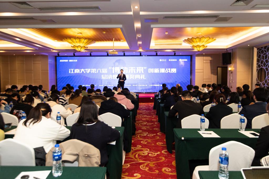 3月22日,江南大学第六届“博动未来”创新挑战赛总决赛暨颁奖典礼在长广溪宾馆太湖厅圆满落幕。博世动力总成有限公司新业务发展部总监冯琦峰、创新平台经理金鑫、博世工业4.0高级经理崔清、博世工程体系专家HUG Juergen,江南大学教务处副处长吴宝锁、团委副书记杨飏、学生工作部(处)创新创业服务科科长杨宏华,物联网工程学院党委副书记孔丽丹、副院长樊启高,国家大学科技园总经理助理张翼参加本次活动并担任评委嘉宾,全校300余名师生共同参与本次活动。