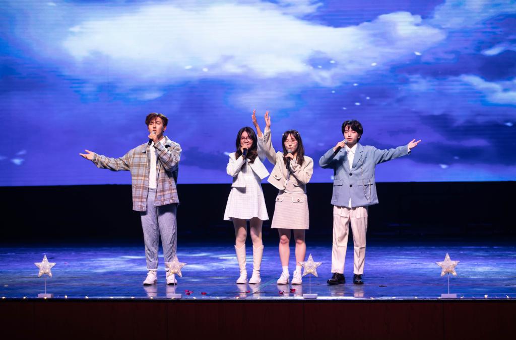 第三篇章,梦的光点,砥砺奋进新时代。由艺术团主持礼仪部表演的《花之舞》走秀震撼全场,精致的妆容与优美的走姿相得益彰,于浪漫优雅中呈现张驰有度的动感;艺术团话剧部带来的话剧《反诈银行》以接地气的造型,网络上熟悉的梗,再现了当下诈骗分子五花八门的行骗手段,让大家在欢声笑语中掌握了反诈知识,提高了识骗防骗能力,引得观众阵阵笑声;艺术团声乐部的歌曲《飞云之下》让人身临其境,鼓励着同学们勇于挑战,不负韶华;辅导员和班助们的舞蹈《开心超人》活力四射,大家纷纷拿出手机拍照录像,在班群里分享着这欢乐一刻。
