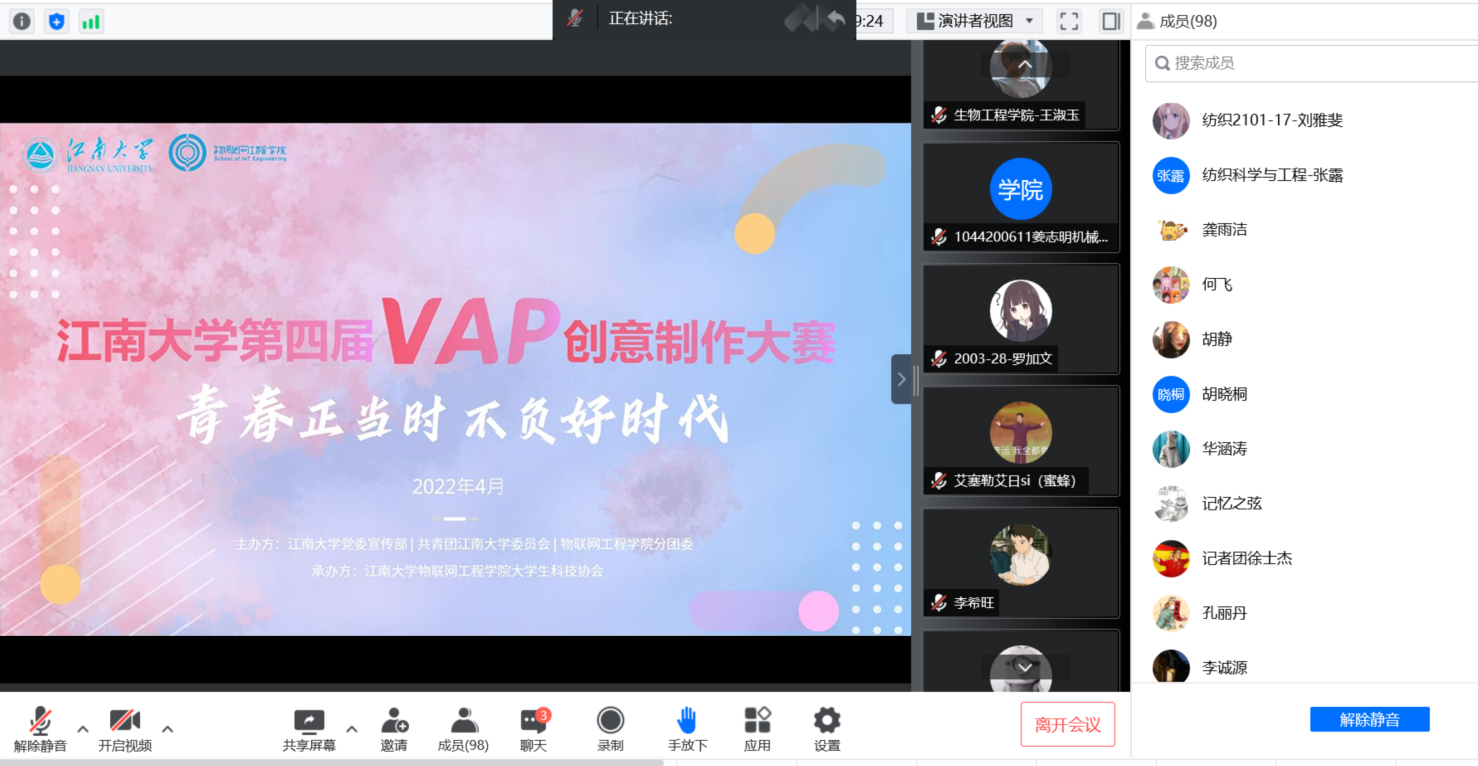 近日,为喜迎党的二十大,携手奋进新征程,在五四青年节来临之际,由校党委宣传部、共青团江南大学委员会、物联网工程学院联合举办的“青春正当时,不负好时代”江南大学第四届VAP创意制作大赛决赛在线上成功举行。物联网工程学院党委副书记、副院长孔丽丹,校党委宣传部网络思政与宣传科科长张铁根,物联网工程学院分团委书记洪筱,物联网工程学院辅导员王志顺、王雪冰、屈跃宽、沈滔出席本次活动并担任评委。