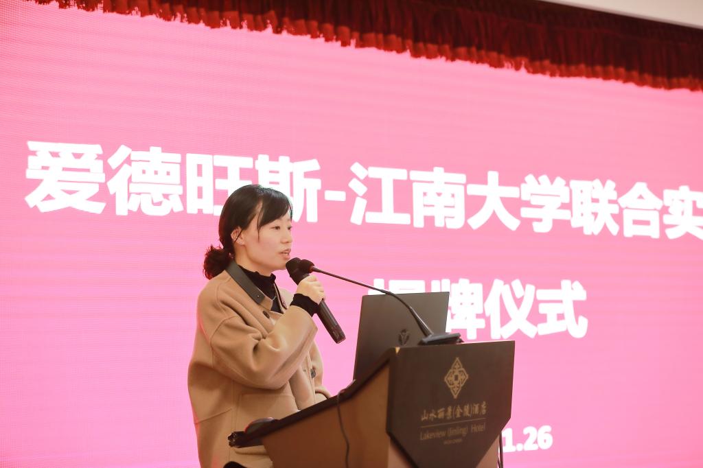 陈莹赟在致辞中表示,校企联合是学校发展的需要,也是企业发展的需要,通过合作,学校和企业可以优势互补,资源共享。她希望江南大学和爱德旺斯公司通过本次产学研合作的契机,构筑良好的校企合作平台,努力为社会培养更多技术型人才,促进校企携手,共同发展。