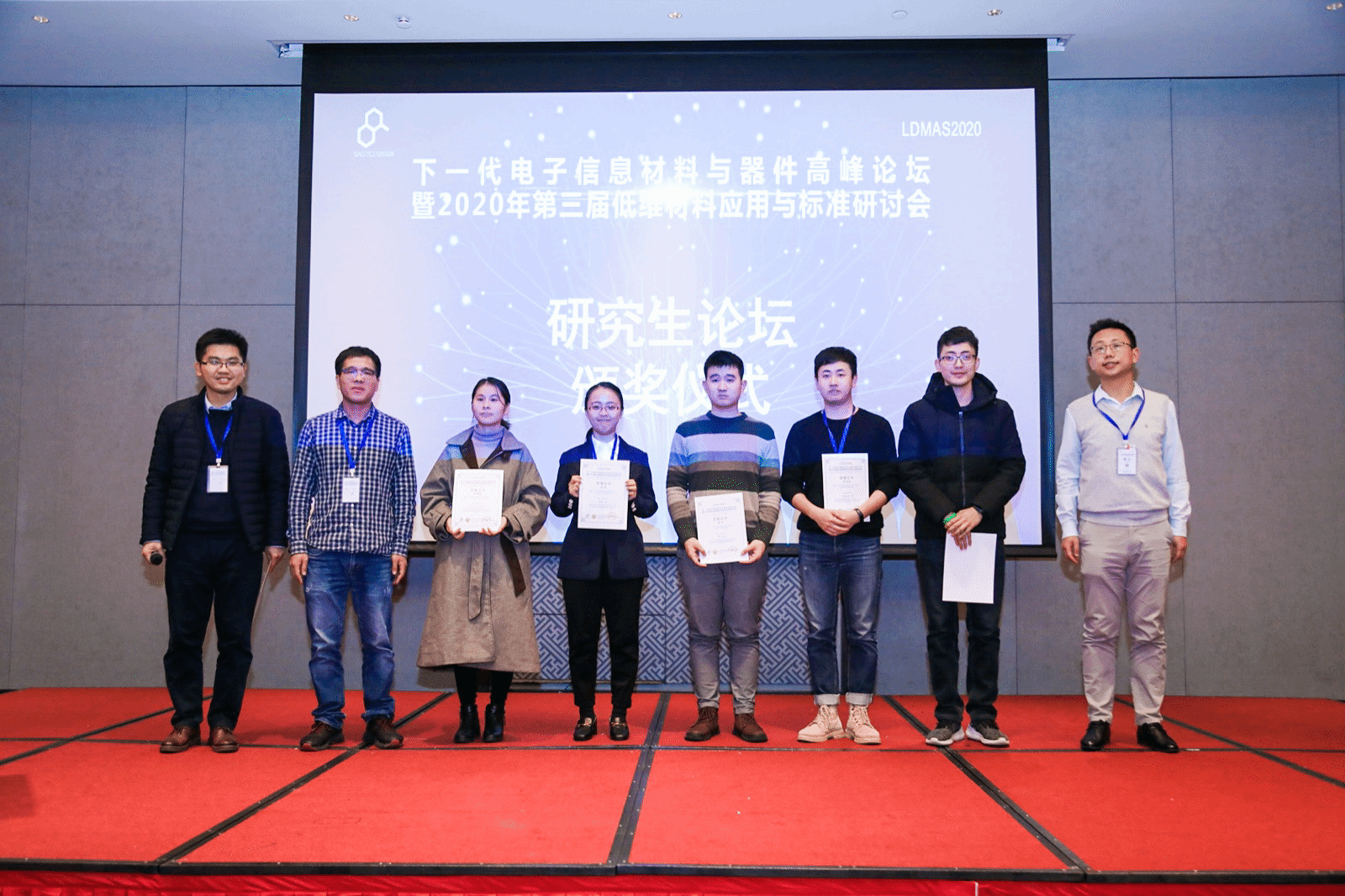 大会以“低维材料应用与标准”为主题,与会专家学者围绕新型半导体材料在下一代电子信息器件中的应用,共同探讨如何提前规划布局、如何政产研融合推进、如何参与和主导国内外相关标准等重要议题。我校物联网工程学院电子工程系肖少庆、南海燕和万茜三位老师带领团队学生出席并参加会议,其中肖少庆老师受组委会邀请针对目前低维半导体的制备和光电性能的提升,做了交流汇报;团队多名研究生参加了研究生论坛环节,与多所985院校博士研究生一起交流讨论,其中研二学生倪俊豪和谭朴的报告得到了与会专家的高度认可,荣获优秀报告奖。