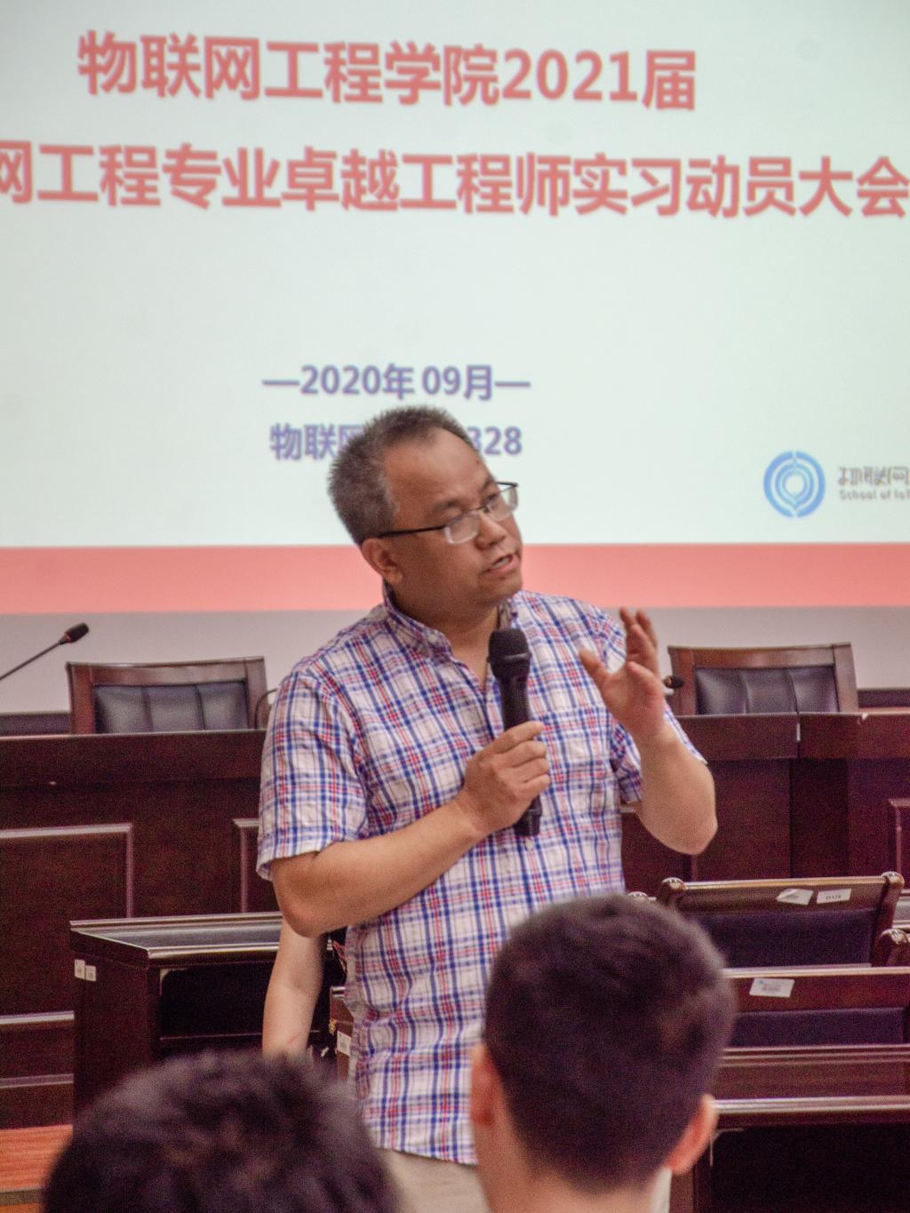 朱启兵结合自身求学、执教经历,回顾了物联网工程专业的创立、发展历程,从为什么要实习、如何实习、实习效果三个维度全面地介绍了实习工作。他指出,学院的物联网工程专业是国家特色专业、教育部首批“卓工计划”、首批“专业综合改革试点”专业,他希望同学们统一思想,始终以爱校荣校、爱院荣院的深厚感情,饱满的工作热情、高度的责任感和使命感投身到工程实践中,在校内导师和企业导师的指导下,顺利的完成实习工作。