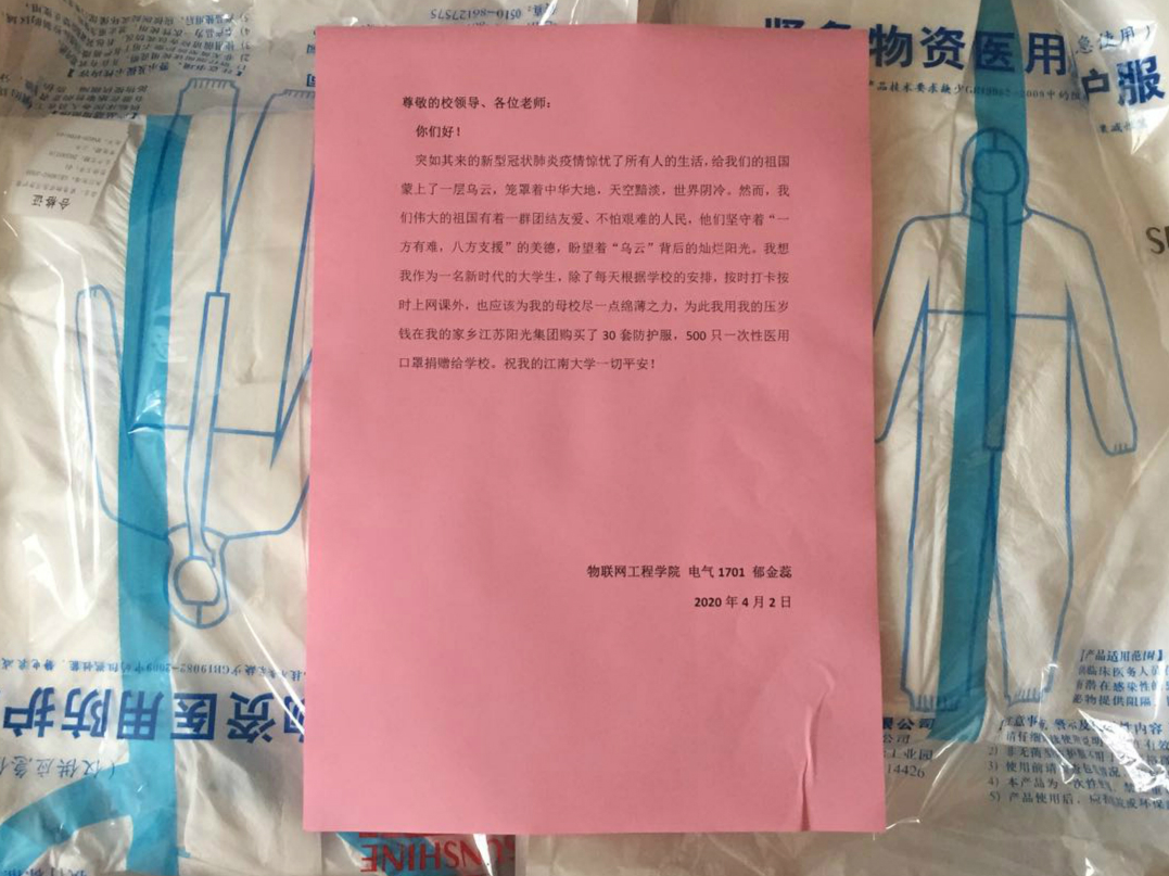 4月7日上午,学校校长办公室收到了满载郁金蕊同学拳拳回报母校爱心的“抗疫”包裹。郁金蕊同学在信中表示:抗击疫情,人人有责。作为一名新时代的大学生,除了每天根据学校的安排,按时打卡认真上网课外,也应该为我的母校尽一点绵薄之力。但自己还是在校学生没有收入,所以用自己多年积攒的压岁钱,在自己家乡的江苏阳光集团购买了30套防护服和500只一次性医用口罩,希望为学校增添一份安全保障。能为母校做点力所能及的实事,是自己的本分,更是无上的光荣。