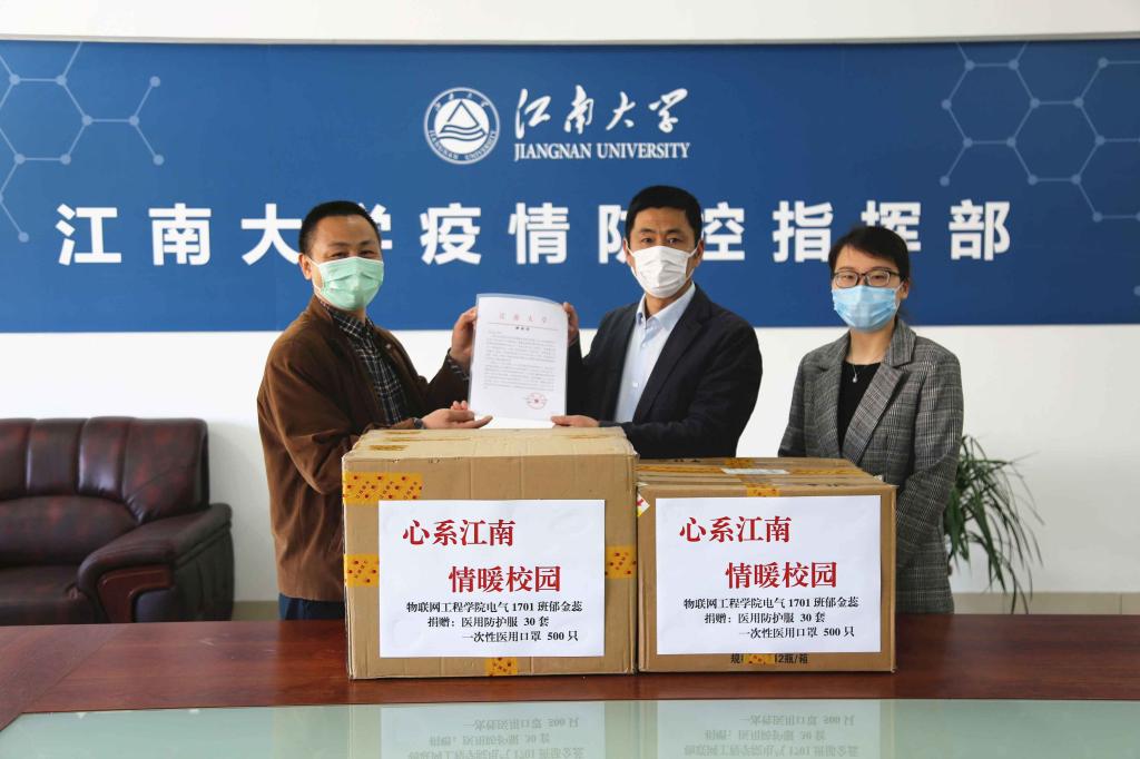 江南大学校党委副书记、副校长戴月波代表学校接受捐赠,并转达了学校的诚挚感谢,对郁金蕊同学自发性的爱心捐赠表示了肯定和赞许。物联网工程学院党委副书记耿向阳介绍到:郁金蕊同学在与辅导员的沟通中,了解到学校复学在即防疫物资比较紧张的情况,就积极行动起来。这样的爱心驰援,不仅是一种物质上的支持,更是精神上的鼓舞,在她的身上充分体现了物联学子心系母校、心怀感恩、甘于奉献、勇于担当的强烈责任感和使命感,为她点赞。