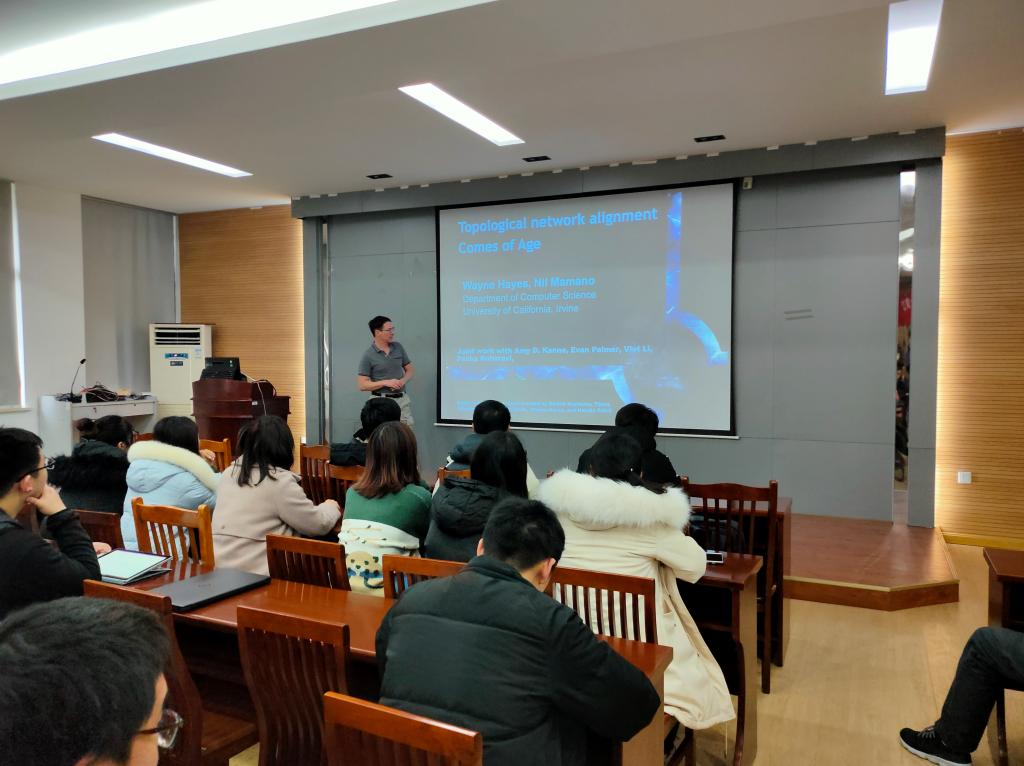 会上,Hayes教授首先通过介绍蛋白质的序列比对引出基于拓扑的网络比对。然后介绍了蛋白质网络比对的简易模型和比对方法,展示了他和他的团队研究的SANA算法,详细讲述如何将模拟退火算法应用到SANA算法中,并从各方面介绍了算法的比对效果。Hayes教授精彩的报告赢得了大家的阵阵掌声,同时又引发了与会人员的深入思考,给生物学和计算机学科的师生带来了很大的启发。