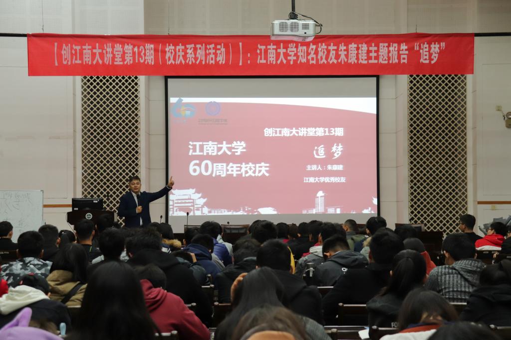 讲座中,朱康建首先对甲子校庆献上了自己的祝福,并祝愿江南人站在又一个甲子的开端,开创更美好的未来。接着,他在回忆了自己的求学岁月后,向同学们发问:我们应该如何度过自己的人生?朱康建强调,作为一个中国人,我们的人生应与“中国梦”息息相关。通过早年学子艰苦求学的图景,他向同学们解读了“中国梦”的实现和国家富强的重要意义。他表示,如今正是国家发展的良好时机,正需要同学们努力学习,不断进取,为了愈加清晰的中国梦而努力奋斗。追逐“中国梦”,每一个人的小梦想不可缺少。朱康建认为,“立志”是最基本最重要的一步,只要心中有梦想,就会有无穷的动力。随后,他结合自己当年创业的经验,阐释梦想对一个人奋斗过程的重要性。