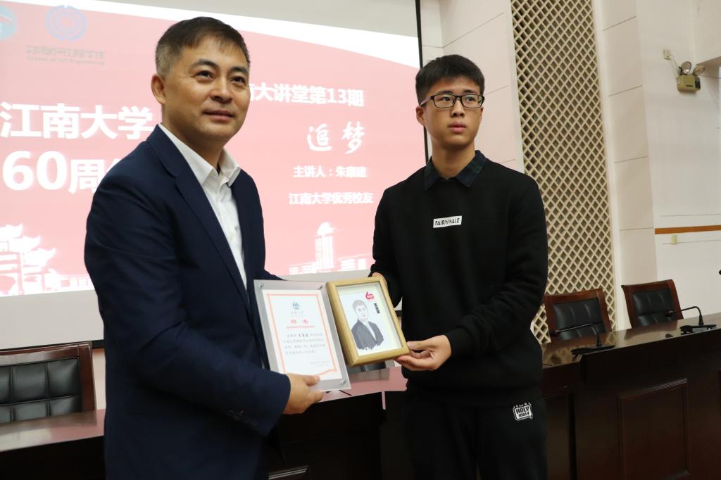 讲座结束后,谢林柏代表学校向朱康建颁发了江南大学创业导师聘书,并表示未来将为校友和在校学子提供更多交流机会,让优秀校友的江南精神影响更多学子。物联网工程学院学生会代表全院学生向朱康建赠送了一幅画像作为纪念。在雷动的掌声中,讲座圆满结束。