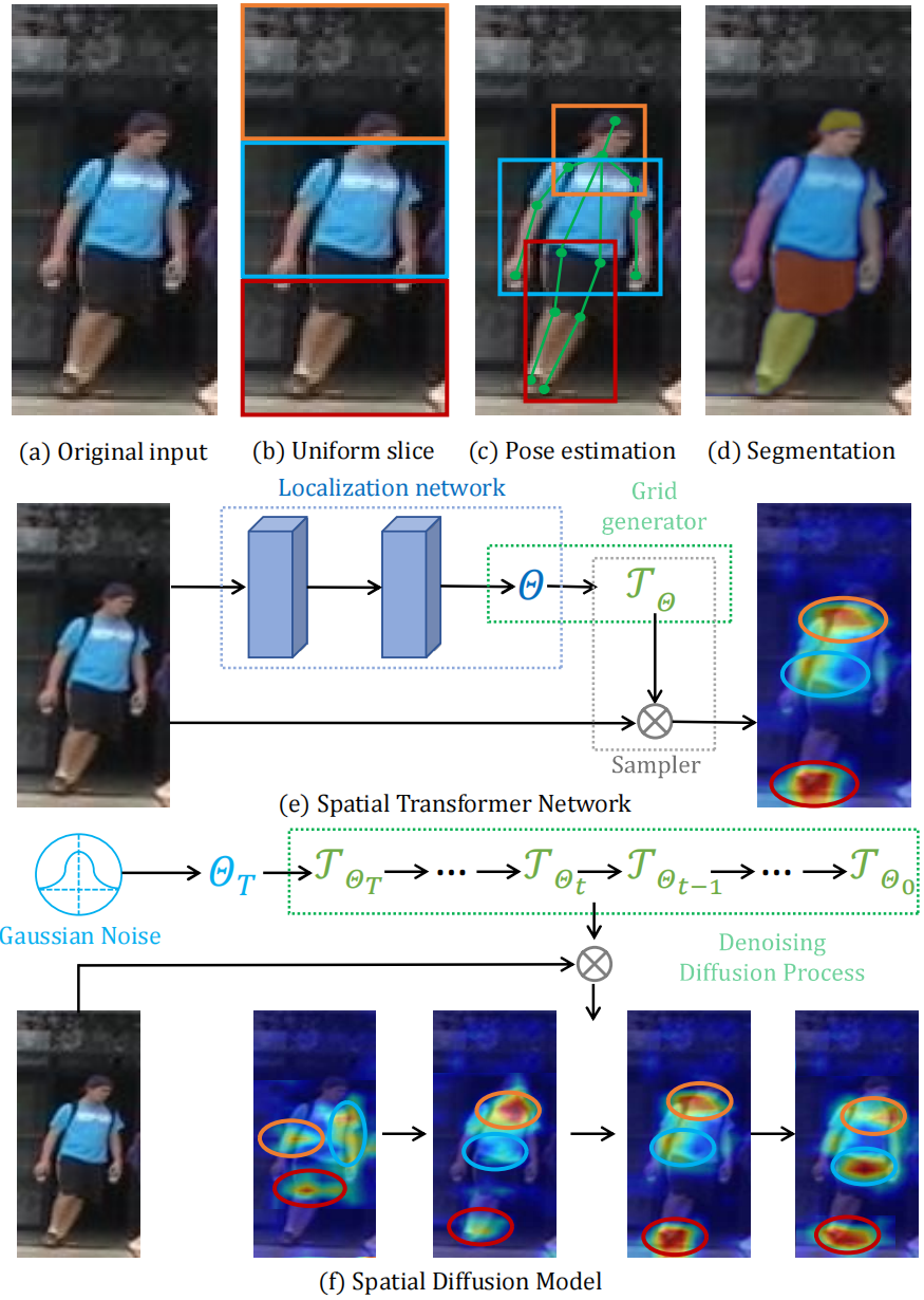 该论文研究内容聚焦于人工智能前沿的扩散模型(Diffusion Model)技术,生成富含行人语义的特征块。如图所示,研究团队创新性地提出了基于扩散模型的行人固有语义学习框架,并精心设计了语义可控扩散损失来精准引导扩散模型的去噪方向,实现了无需借助先验知识或额外网络,便能生成语义对齐且泛化性强的特征块。此项研究为通用式人工智能应用场景下的无监督行人目标检索提供了新的范式。
