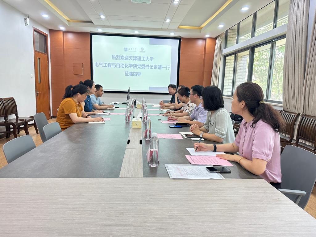 吴妍代表学院对张靖一行表示欢迎,全面介绍了学院党委在基层党建创新、推动“一融双高”等方面的工作思考与有效措施。她着重强调,学院党委始终坚持将党建工作与业务工作深度融合,切实发挥基层党组织的战斗堡垒作用。陶洪峰和张靖分别围绕学院历史沿革、学科发展、专业建设、师资队伍、人才培养等方面进行详细阐述。他们讲到,双方在专业设置、人才培养等方面各有特色与优势,希望能够各取所长、相互学习。沈艳霞详细介绍了电气工程专业的发展现状、学生培养等情况。