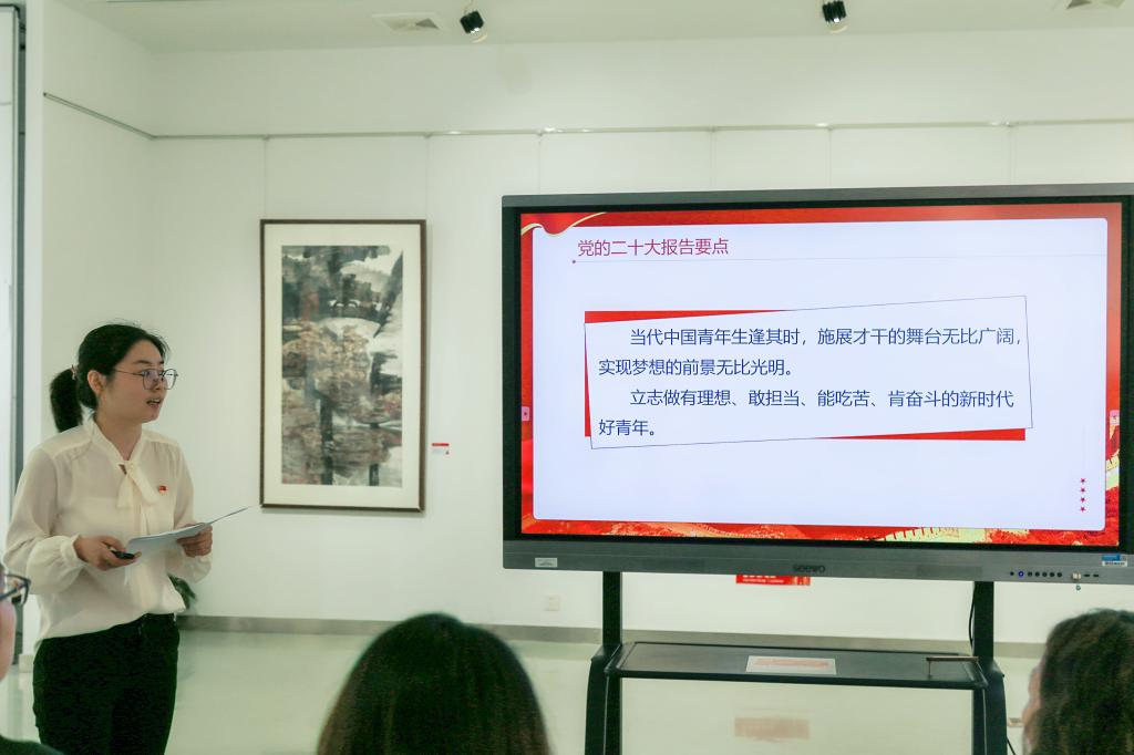 随后,党支部书记魏纯在钱绍武艺术馆一楼展陈区领学党的二十大报告。她重点介绍了党的二十大报告整体框架和主要内容,结合控制学科专业特点,着重强调了与青年息息相关的科教兴国战略、推进文化自信自强、推进国家安全体系和能力现代化等内容,并呼吁支部党员要牢记习近平总书记殷切嘱托,在党的领导下以理想者、担当者、吃苦者、奋斗者的姿态,让青春在全面建设社会主义现代化国家的宏伟征程中绽放绚丽之花。