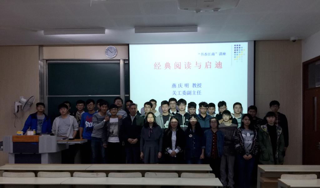 近日,自动化1501王选特称团支部和电气1502 瞿秋白特称团支部“阅读经典,点亮人生”主题教育活动在一教1A213举行。活动邀请到了物联网学院关工委的燕庆明教授,自动化1501班和电气1502班全体同学积极参加活动。