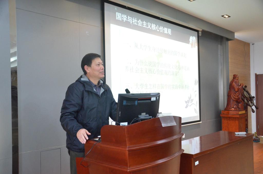 在“悟道德”环节里,程勉中老师以“国学与社会主义核心价值观”为题,给大家带来了一场精彩的讲座。程老师首先向大家解读了国学的基本内涵,其次,他指出,国学的传统文化精华是涵养社会主义价值观的源泉,即“自强不息、以和为贵”等思想是“富强、民主、文明、和谐”这一国家层面价值目标的源泉,“仁爱、中正、天下为公”等思想是“自由、平等、公正、法治”这一社会层面价值目标的源泉,“忠、义、诚、信、礼”等思想是“爱国、敬业、诚信、友善”这一公民层面价值目标的源泉,从国学到社会主义核心价值观,不同层次不同内容的“道德遵循”是主要价值追求之一。最后,他希望同学们在身心的维度追求“道以养生”,在情感的维度追求“诗以抒情”,在道德的维度追求“儒以涵德”,在智慧的维度追求“慧以净心”,以校训“笃学尚行、止于至善”为引领,培养好德性,坚守好德行,做社会主义核心价值观的践行者。接着,在场所有同学在主持人带领下,在文明礼貌,爱护环境,诚实守信,乐于助人,文明上网,遵守校纪,律己修身等方面,提出“建文明校园,做文明学生”的倡议,并在倡议书上签字,以响应建设文明校园的号召。