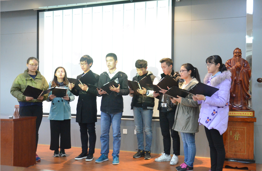 本次活动主要分为观模范、听榜样、家国梦、修身志、悟道德、提倡议、送吉祥六个环节。在“观模范”环节里,同学们观看了“乐于助人”道德模范谢亮老人的事迹,谢亮老人10年如一日为他人义务指路,用自己的行动诠释了“帮助他人,快乐自己”的道德真理。接下来,朱道永同学在“听榜样”环节给大家讲述了一位27年坚持给贫困地区、革命老区、自然灾害地区捐款捐物的道德榜样张纪清老人的故事,同学们纷纷被他乐善好施的品德和善行所打动。在“家国梦”环节里,12位培训学员用最为真挚的情感和灵动的声音,传递了爱国爱民的道德情怀。在“修身志”环节里,8位培训学员朗诵了国学经典《大学》,抑扬顿挫的音调激起了在场同学们的共鸣,让大家再次认知了明德、亲民、至善的道德遵循。