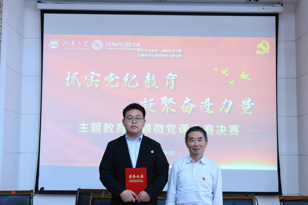 为确保党纪学习教育取得扎实成效,切实发挥基层党支部的政治引领功能,6月6日,物联网工程学院“抓实党纪学习教育、凝聚奋进力量”主题教育微党课大赛决赛于物联网工程学院D328举行。物联网工程学院党委书记张华,关工委常务副主任吴锡生,关工委委员朱凯元、赵曾贻、刘营生,专职组织员糜海燕,党建辅导员张圆,研究生辅导员王雪冰,本科生辅导员曾磊和谢幸福出席活动并担任评委,学生党员代表和入党积极分子观看比赛。活动由研究生屈家俊、曾雨萱主持。