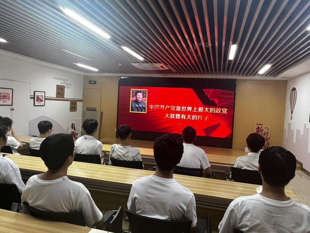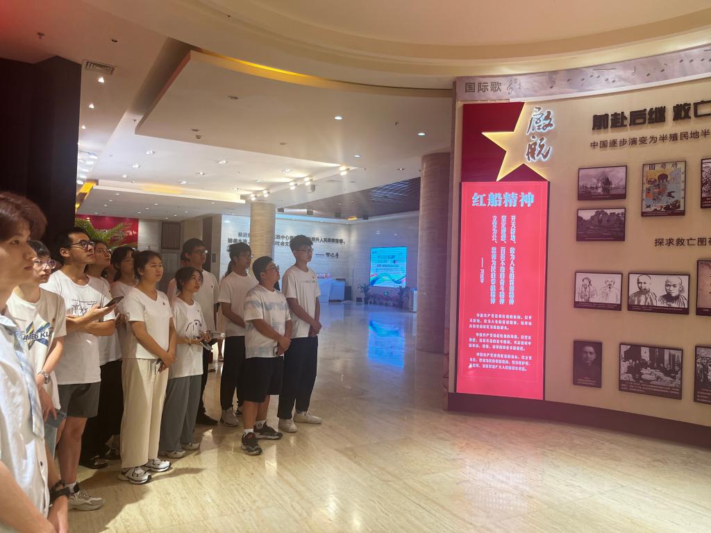 在讲解员的引导下,实践队一行于当天下午参观了无锡滨湖党建馆的大型展览《中国共产党人的精神谱系》。展览以中国共产党红色精神为主线,历经星火、圣地、烽烟、黎明、奋斗等党史“长廊”,在图文并茂、生动形象的历史“链条”指引下,同学们沉浸感受了贯穿中国和世界的百年沧桑巨变,并在现场以问答互动的形式进一步体悟中国共产党的光辉历程和伟大精神。在丰碑展厅革命烈士纪念墙前,同学们敬献鲜花,缅怀革命先烈。随后,集体观看党史专题视频《红色之路》。影片中一幕幕令人“破防”的画面,一句句直抵心灵的台词,让全体成员受到一次深刻的党性教育和精神洗礼。同学们纷纷表示,从党波澜壮阔的历史中汲取了营养、获取了力量,也更加坚定了“走红色之路,做红色传人”的理想信念。