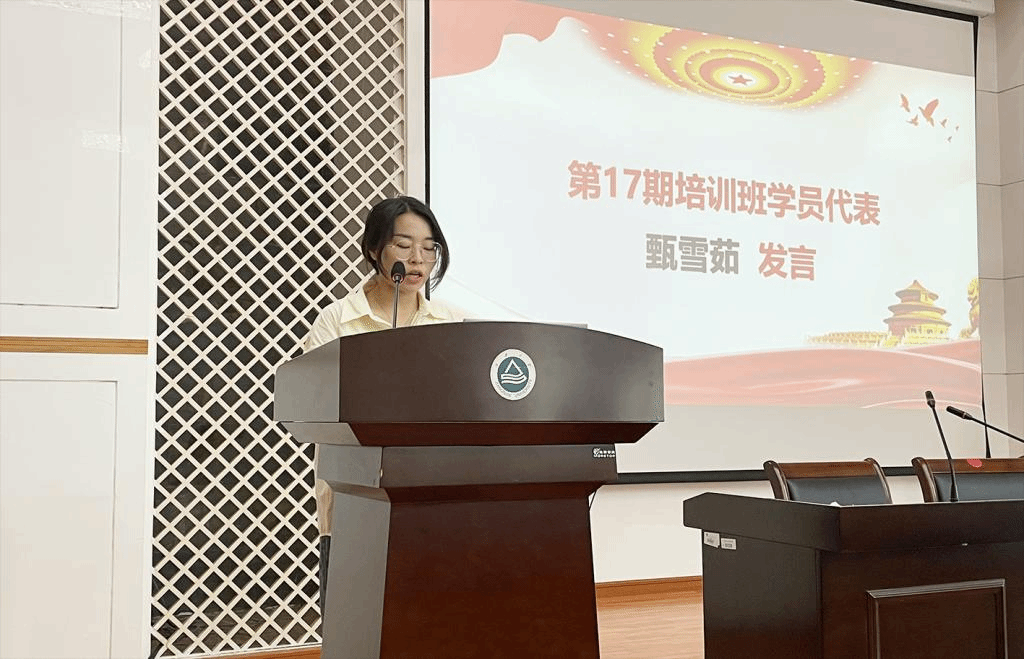 随后,甄雪茹代表第17期培训班学员做表态发言,她表示将坚定跟党走的信念,怀揣理想,脚踏实地,提升素质能力,服从组织管理,遵守纪律规矩,不辜负组织的信任,以饱满的学习热情投入到培训中,立志做有理想、敢担当、能吃苦、肯奋斗的新时代好青年,成长为党和国家事业薪火相传的接班人。接着,李灿介绍了培训班学习计划。