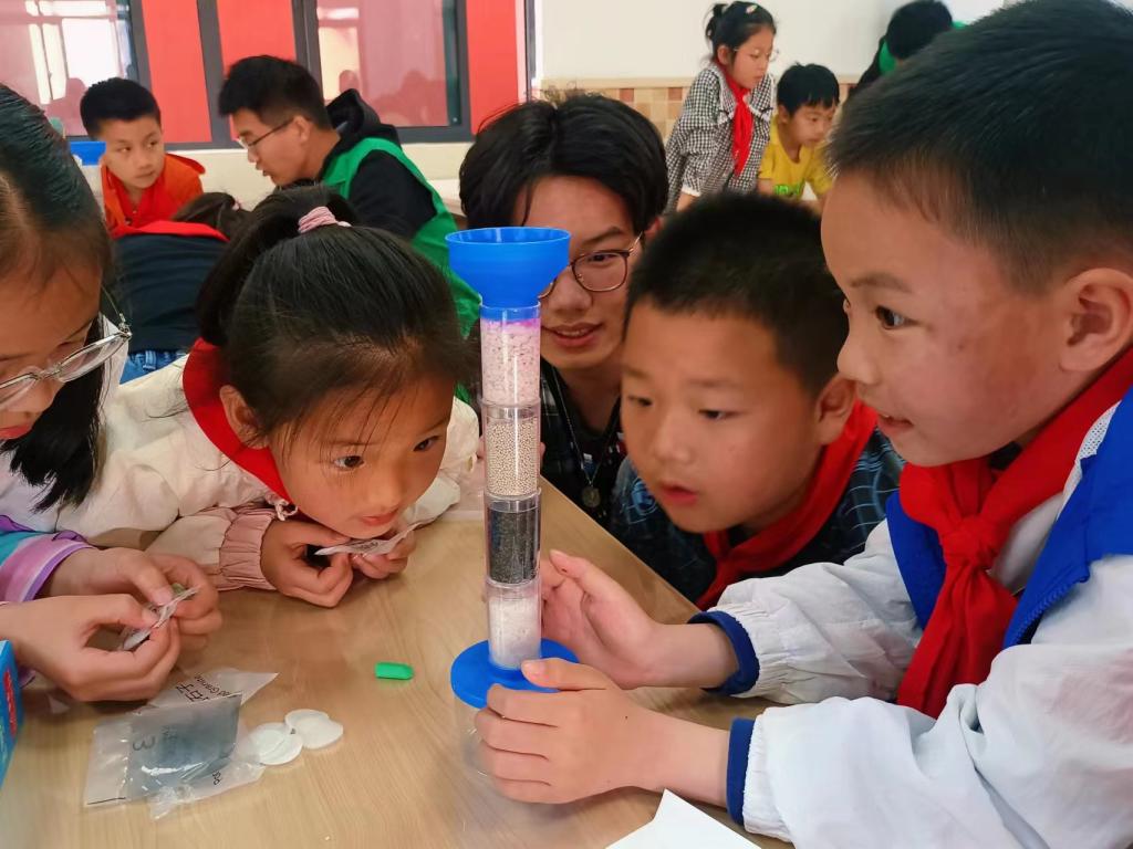 “脏水从这个漏斗口流下去,从上到下,依次经过花岗岩石子、瓷沙、活性炭、石英砂的过滤,最后杂质就被吸走了。”实验中,一位小朋友用稚嫩的语言向我们复述装置的实验原理。越来越多的小朋友向志愿者分享实验成果“老师老师!水变干净了!”“老师!颜色被吸走了!”。通过实验,孩子们对水环境的相关知识了解更近一层。