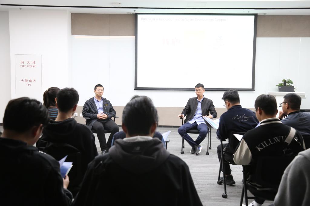 校友交流环节是本次活动的重头戏。毕业于物联网工程学院的校友代表陈家乐、段飞腾分享了自己的求职经验、在博世的工作体验和行业发展趋势,并与学生就自动驾驶、智能座舱等方面进行了技术交流探讨,让学生们更加真实地感受到企业的工作环境和就业前景。学生们也积极与学长交流,提出了自己在专业学习、职业发展等方面的问题,获得了专业的指导和建议。