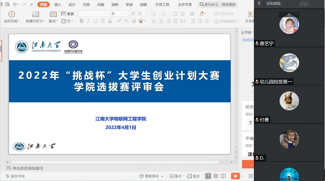 为培养学生创新探索精神,积极备战2022年“挑战杯”全国大学生课创业计划竞赛,4月2日,物联网工程院组织开展了“挑战杯”全国大学生创业计划竞赛学院选拔赛。国赛评委金国巍、物联网工程学院党委副书记孔丽丹、团委书记吴垚作为评委出席了本次答辩竞选,评审会由辅导员屈跃宽主持。