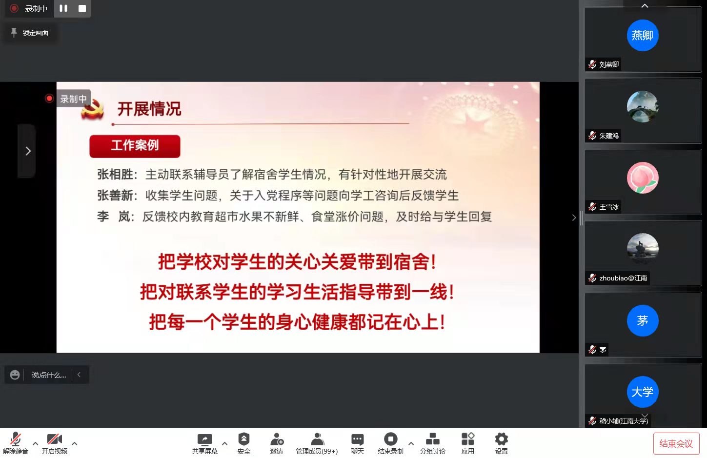 孔丽丹就上月16日学院召开党员教职工联系学生宿舍动员会后的推进情况进行介绍。她进一步明确七大工作职责,梳理推进落实措施,对教师党员中已开展的工作案例进行分享,并反馈了部分学生宿舍的对接感想。通过线上交流,进一步引导广大党员教职工,思想上以学生为本、拉近师生距离,积极发挥自身在教书育人、管理育人、服务育人中的先锋模范作用;行动上回应学生关切、送上关心问候、献上爱心嘱托,切实做好对我院学生的关怀帮扶。