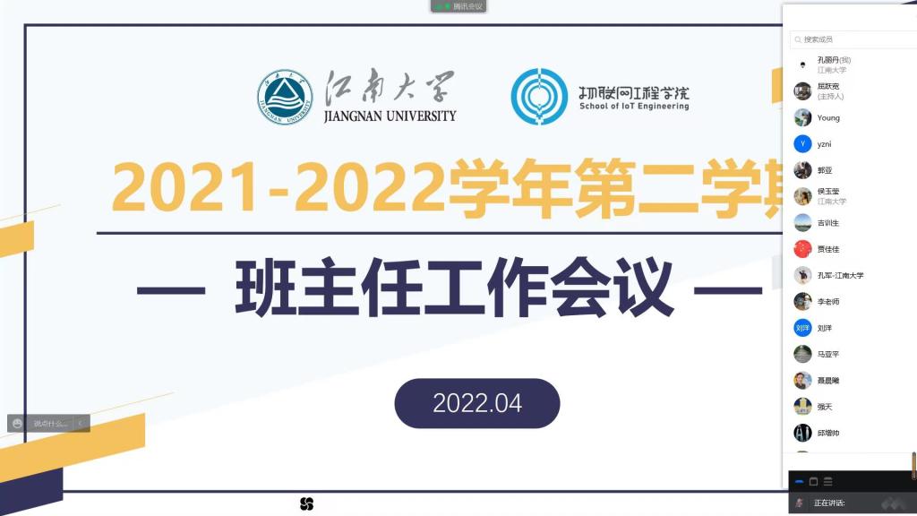 4月3日上午,物联网工程学院疫情防控工作班主任专题会议在线上举行,学院党委书记程捷音、副书记孔丽丹主讲,全体辅导员、班主任老师参加会议。