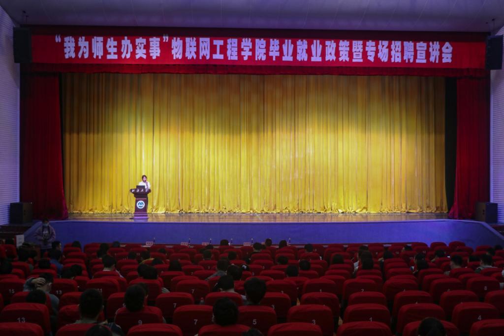 10月24日下午,物联网工程学院毕业就业政策暨专场招聘宣讲会在文浩馆观众厅举办。学院党委副书记、副院长孔丽丹,学院教务办孙洁,毕业班辅导员侯玉莹、王雪冰出席会议,无锡信捷电气股份有限公司、华勤技术股份有限公司等企业的人事部门代表应邀参加活动,学院2018级全体本科生参加大会。