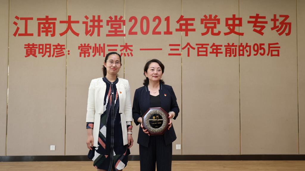 宣传部副部长陆敏芝为黄明彦馆长颁发“江南大讲堂讲座教授”纪念牌