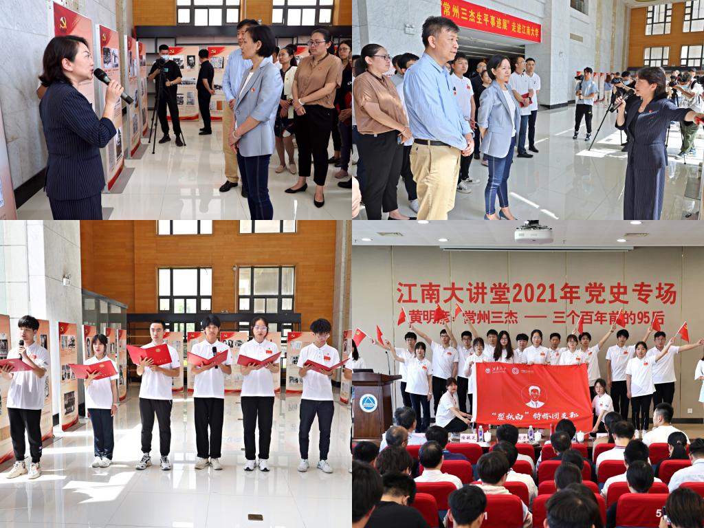 系列活动之一的常州三杰生平事迹展开幕仪式在图书馆一楼展览厅举行。物联网工程学院瞿秋白特称团支部的团员以诗歌朗诵《江南一燕 诸夏怀霜》为此次活动拉开了序幕。黄明彦与程捷音为“常州三杰生平事迹展”走进江南大学揭幕。在黄明彦的导引下,在场师生一起参观了“常州三杰”的生平事迹展,去聆听和感受革命先辈的奋斗故事和赤诚初心。事迹展将在学校展出1个月,瞿秋白特称团支部学生担任讲解,面向全校党支部、团支部开放讲解预约。