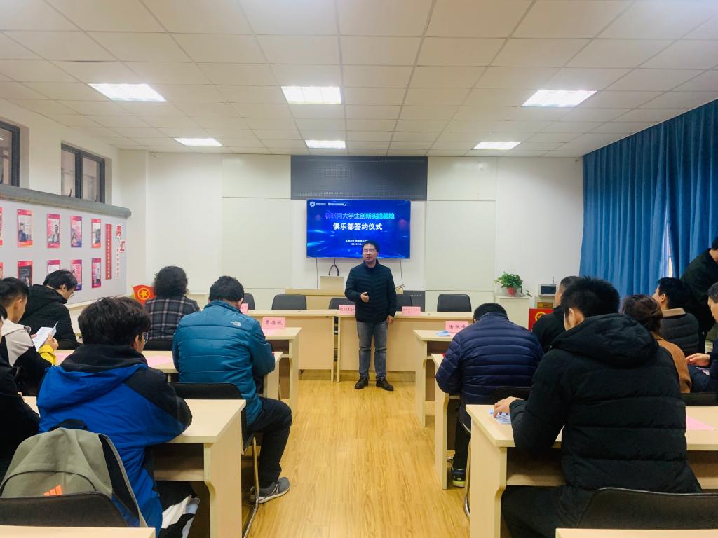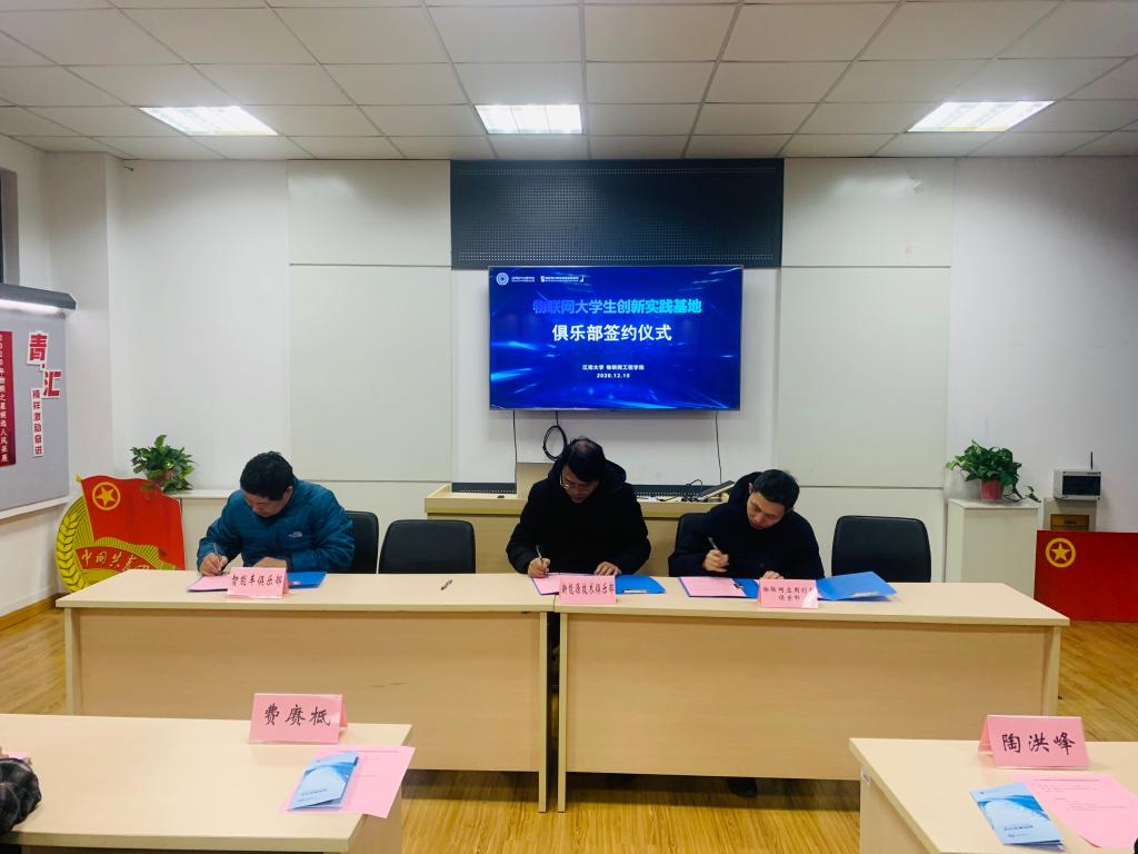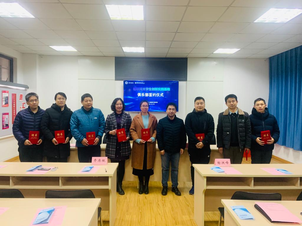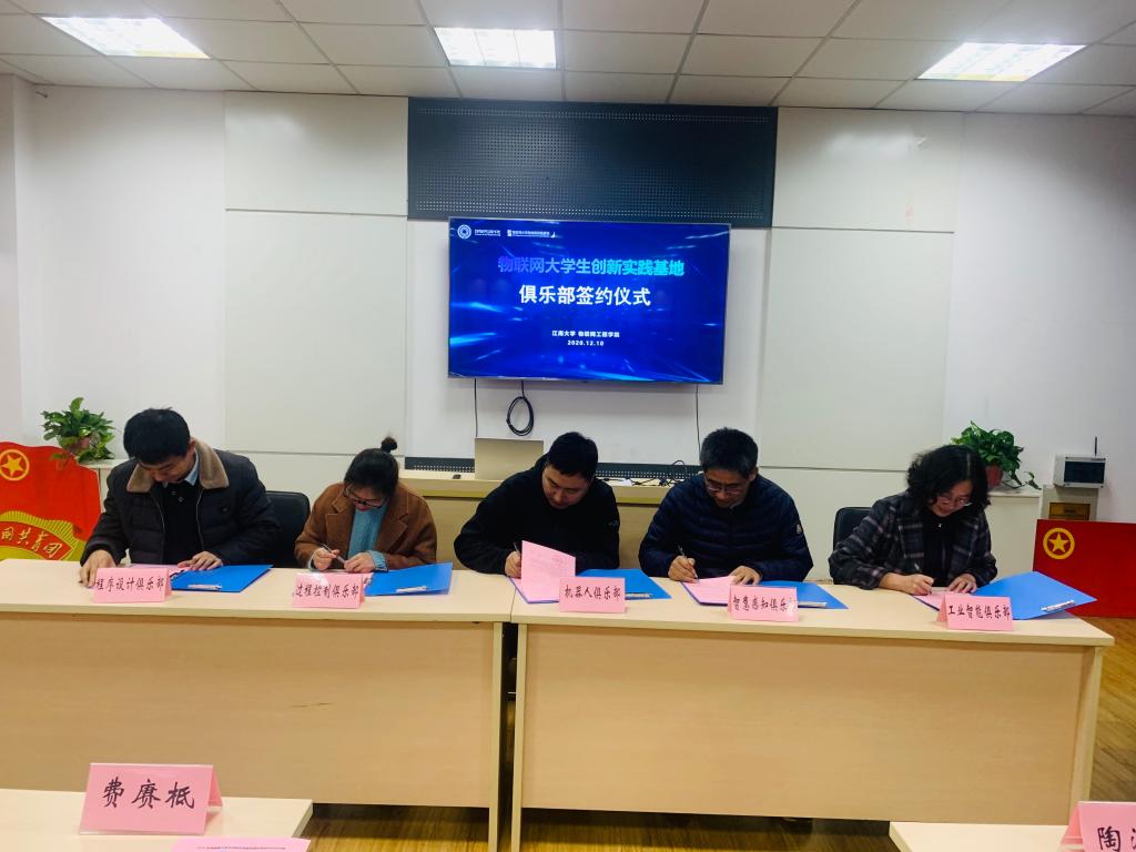 为进一步推进学院调整后物联网大学生创新实践基地建设,加强和规范基地创新俱乐部的管理,为学生课外创新实践创设更好的条件。近日,物联网工程学院大学生创新基地优化工程启动活动——大学生创新实践基地俱乐部签约仪式在物联网工程学院C121会议室举行。物联网工程学院副院长陶洪峰、学院大创基地负责人费赓柢、分团委书记吴垚、辅导员屈跃宽及创新俱乐部责任指导老师、俱乐部学生代表出席本次签约仪式,仪式由费赓柢主持。