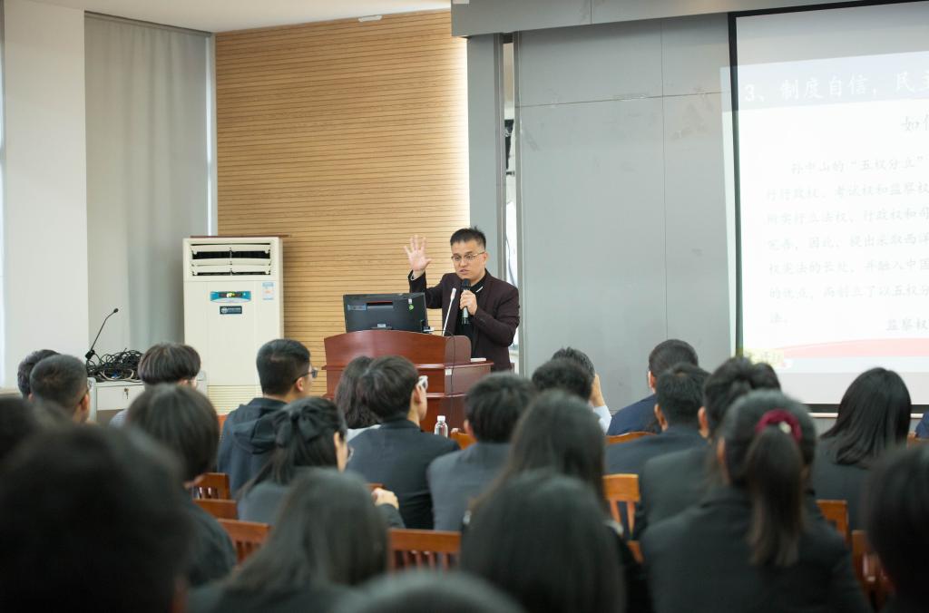 在11月中旬学院举办的第十一期“青马工程”训练营开营仪式上,马克思主义学院唐忠宝教授为营员们作了一场《在国际比较中坚定“四个自信”》的开营讲座,给所有同学上了一节生动的信仰课。