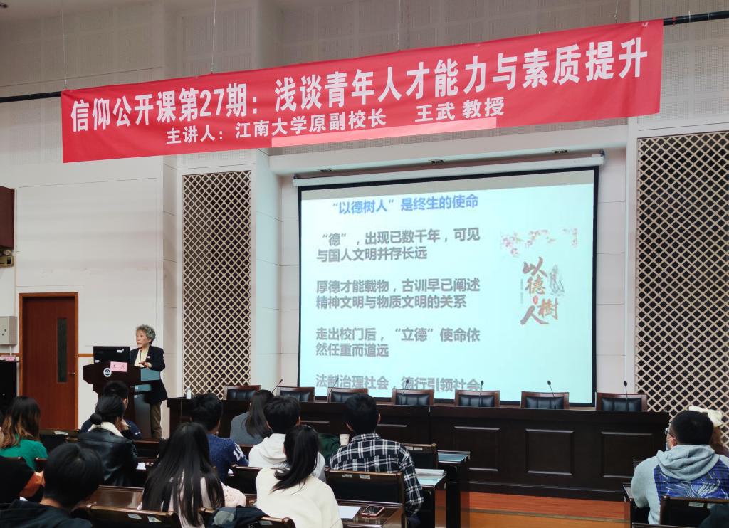 时隔“青马工程”训练营开营仅一周,学院邀请原江南大学副校长王武教授为全体营员和第12期入党积极分子培训班学员作了一场以《浅谈青年人才能力与素养提升》的信仰公开课,为同学们如何在人生道路上提升能力和素养,点燃一盏明灯。