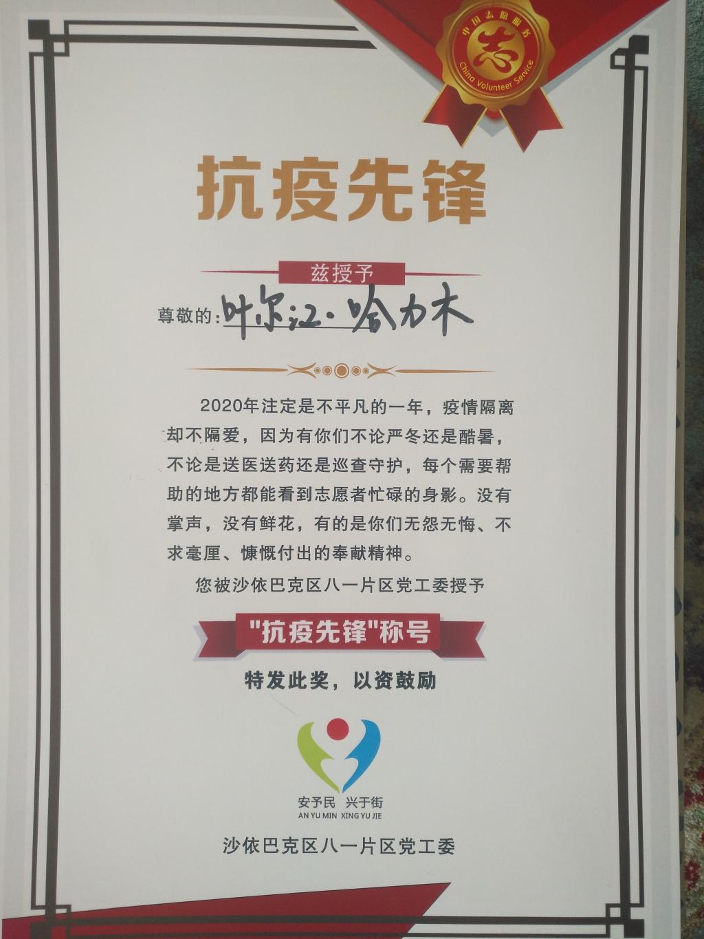 叶尔江·哈力木获“抗疫情先锋”称号