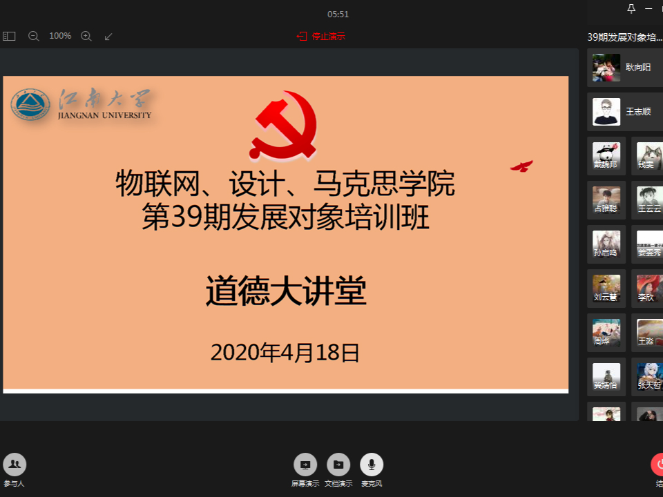 在疫情防控和延期开学的特殊时期,为加强学生党员发展对象培养教育,提高发展对象的政治理论水平和政治意识,近期,工程学院分党校通过企业微信等平台线上开展了一次特殊的云培训。此次分党校培训部分共安排四次直播授课,直播授课分别由江南大学马克思主义学院刘大禹教授、冯皓副教授、孙晨光博士、江南大学物联网工程学院党委副书记耿向阳四位老师主讲,直播课程由物联网工程学院辅导员王志顺主持,参加此次培训的学员来自物联网、设计、马克思3个学院,共计90名学生党员发展对象。