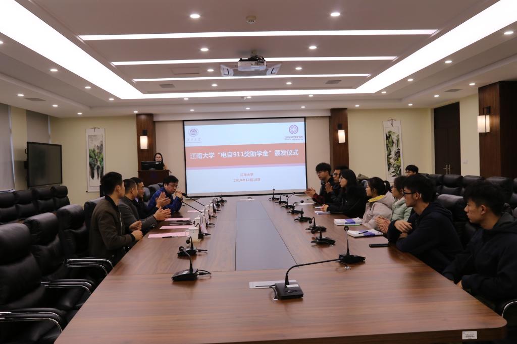 12月18日下午1点30,江南大学“电自911奖助学金”颁发仪式在物联网工程学院B222会议室顺利召开。原无锡轻工大学电自911班校友赵树才、郑成坚,物联网工程学院党委副书记、副院长耿向阳,分团委书记吴垚出席本次颁奖仪式,仪式由19级辅导员李诗炜主持。
