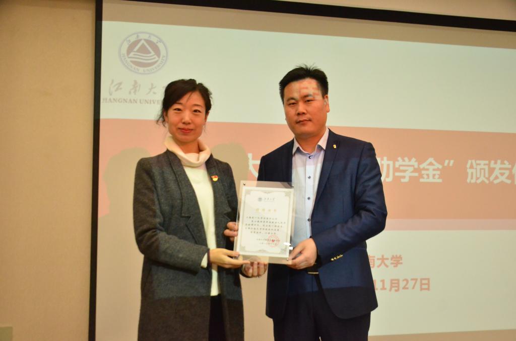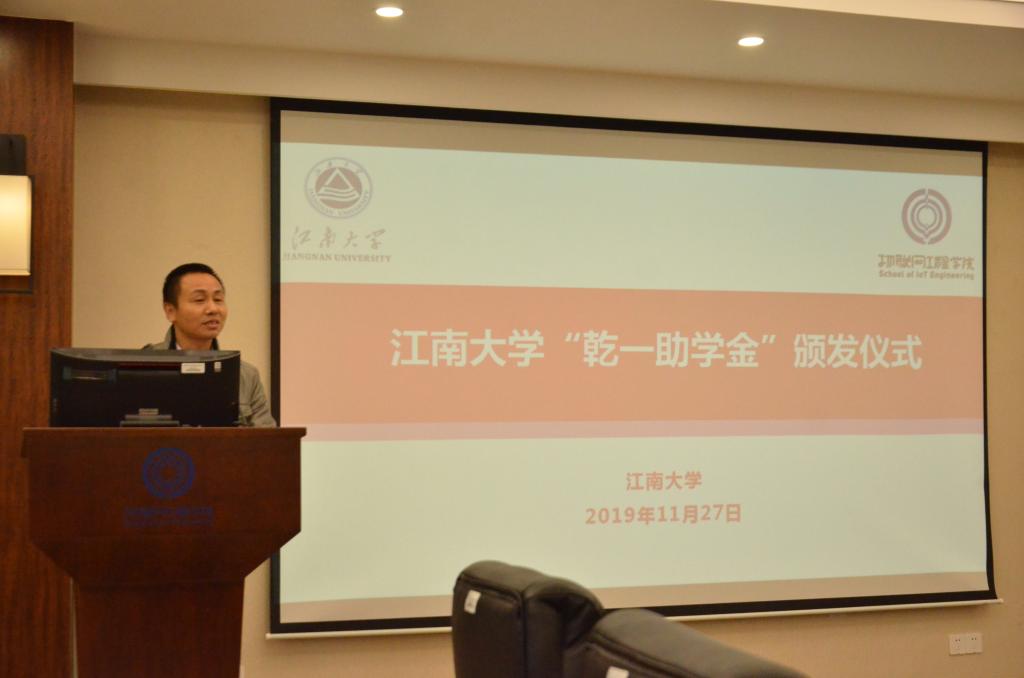 11月27日,2019年“乾一助学金”颁发仪式在我院B222会议室隆重举行。上海乾一化学品有限公司总经理娄宝安、江南大学社会资源处副处长窦新华、院党委副书记、副院长耿向阳以及全体受助学生出席了本次颁发仪式。仪式由辅导员李诗炜主持。