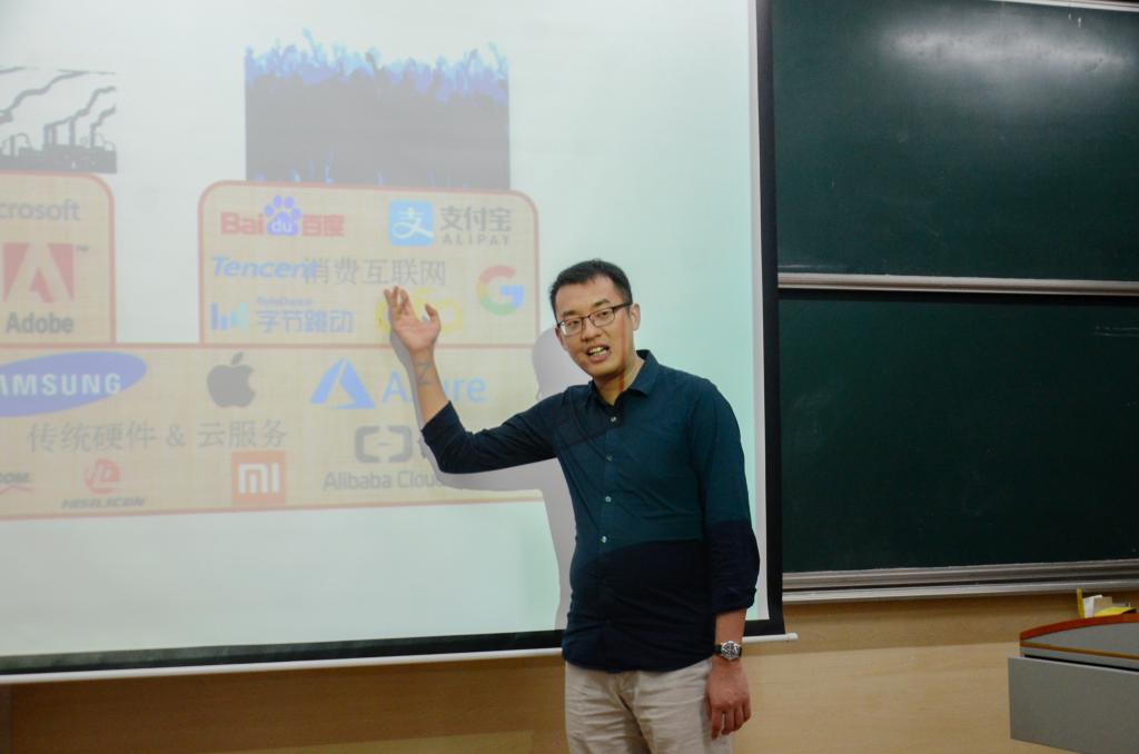 在同学们热烈的掌声中,洪云峰开始了他的精彩演讲。一进场他幽默风趣的说话方式带动了全场的气氛,并在大家的欢声笑语中,揭开了本次讲座主题——互联网。他将互联网行业分成了传统硬件&云服务、消费互联网和传统软件三个部分,并引出了“为什么有人说硬件行业是夕阳产业”、“为什么中国的硬件行业无法像消费互联网行业一样在10年内赶美超英”等多个问题。随后,他以Facebook为例,从专业技术、人口红利、执行力等多个方面比较了服务业与硬件行业,分析解剖以上问题并得到答案,让同学们对如今形势有了深刻清晰的了解。