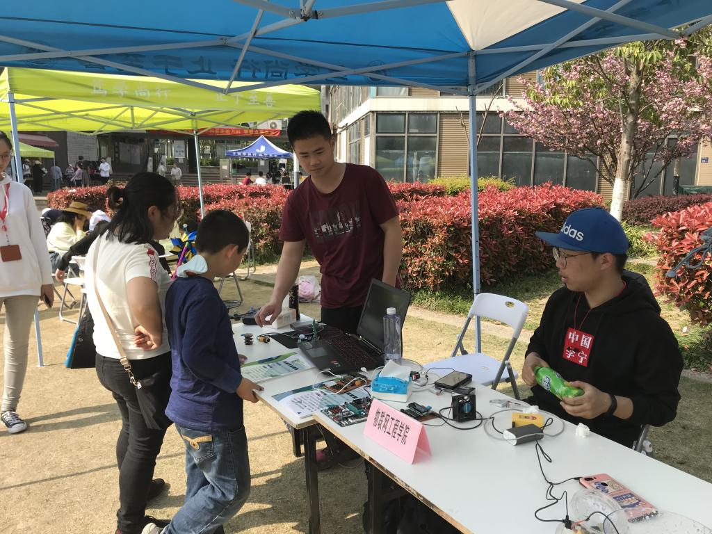 物联网工程学院的展台展示了基于单片机开发的音乐喷泉,温湿度检测报警控温系统,电子密码锁,以及四翼无人机。我院同学热情地给前来参与的大朋友和小朋友们讲解了这些展品其中的原理、工作方式和可以实现的功能。相信通过此次活动能够在小朋友心中种下一颗科学的种子,它在将来会长成参天大树。