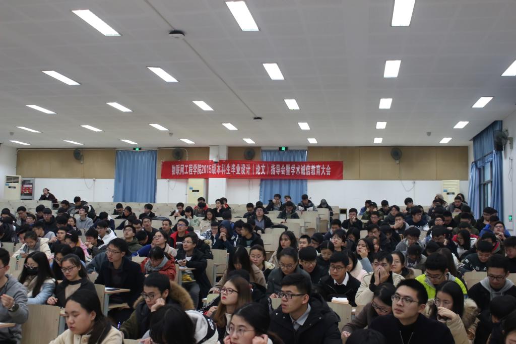2018年12月6日,物联网工程学院2015级学子们在二教2A127参加了本科生毕业设计(论文)指导暨学术诚信教育大会。物联网工程学院分团委书记吴垚、教务办秘书朱志芳、15级辅导员何倩楠出席了本次活动。物联网工程学院举办本次指导与教育大会旨在引导15级本科生正确、高效、顺利地完成他们在本科生阶段毕业环节的任务。