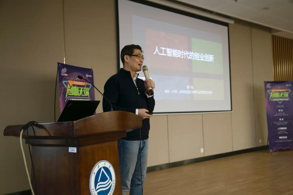 启动仪式上,顾学年、孟静卫、柴志雷、戴子珽上台进行授旗仪式。接着,戴子珽进行了“人工智能时代下的创业创新”主题演讲,他有着20年的IT经验,对人工智能有着深刻研究。戴子珽向大家介绍了全新数字化、云化智联的世界规律:实时、海量、高度社交化、共享、安全性、智能、架构、技能、生存,让大家对人工智能有一个清晰的认识。之后他还系统地介绍了“创新”的概念,他提出科学创新是原始的发明创造,而商业创新是为了创造价值。同学们对创新有了更深一步的了解后,戴子珽又提出了一个令人印象深刻的新颖观点:“科技带领我们进入原本只有梦想才能触及的世界。”接着,他表示:人工智能除了创造商业价值更要创造社会价值。最后他还用比尔·盖茨年过花甲依旧在创业的事例来激励同学们不懈努力,不断创新,用创新触及新的世界。
