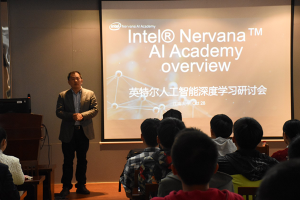 熊黎俊先生首先对同学们来听讲座表示了感谢,并说明希望此次的讲座能够为同学们带来帮助。他表示,来到江南大学,他们会请到人工智能的合作伙伴来为大家讲解他们眼中的人工智能,以便学生能够更好地理解什么是人工智能。他通过一些具体事例向同学们表明人工智能就在我们的身边,我们生活中的许多领域都与人工智能有了相应的结合点,例如医疗、财政、能源、以及交通等,人工智能已经无处不在。他对AI人才培训瓶颈的突破、对人工智能的创业机遇提出了独特的见解。他还带着英特尔人工智能领域的专业知识与到场同学一同进行了深度的学习研讨:以数据科学与机器学习,和神经网络与深度学习两个专业理论问题为主要讨论点,深入并全面地讲解了理论知识及理论与实例的结合运用。他表示,他们发布了面向人工智能的因特尔软件®学生开发人员计划,旨在重点展示学生与英特尔学生大使的专业知识、活跃思维和创新精神,及他们使用因特尔架构的成功经验,从而让学术界更多地了解人工智能,更广泛地采用这一技术。