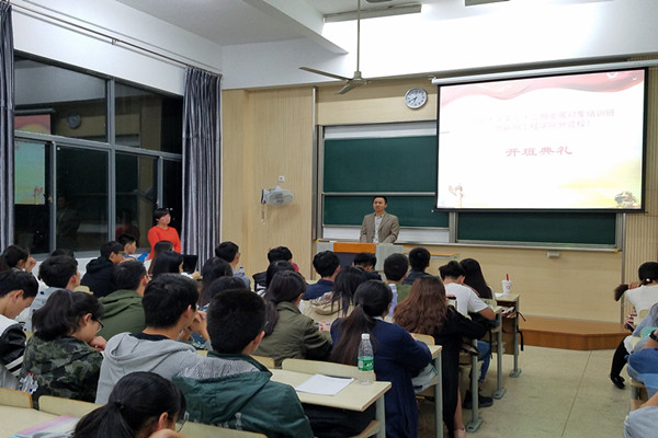 开班仪式结束后,马克思主义学院唐忠宝副教授进行了以习近平同志“七一”重要讲话精神解读为主题的讲座。唐老师以“不忘初心”作为引入点,引经据典、旁征博引,以当下热议的话题为佐证全面透彻地讲述了有关“马克思主义、共产主义、四个自信、全面建成小康社会、全面深化改革、以人为本、和平发展、全面从严治党”的八个“不忘初心”。他着重强调了“信仰”,认为“信仰就是人生存下来的意义,共产主义就是这样一种信仰”。讲座现场因唐老师的诙谐幽默、妙语连珠而笑声不断,最后讲座在同学们热烈的掌声中落下帷幕。