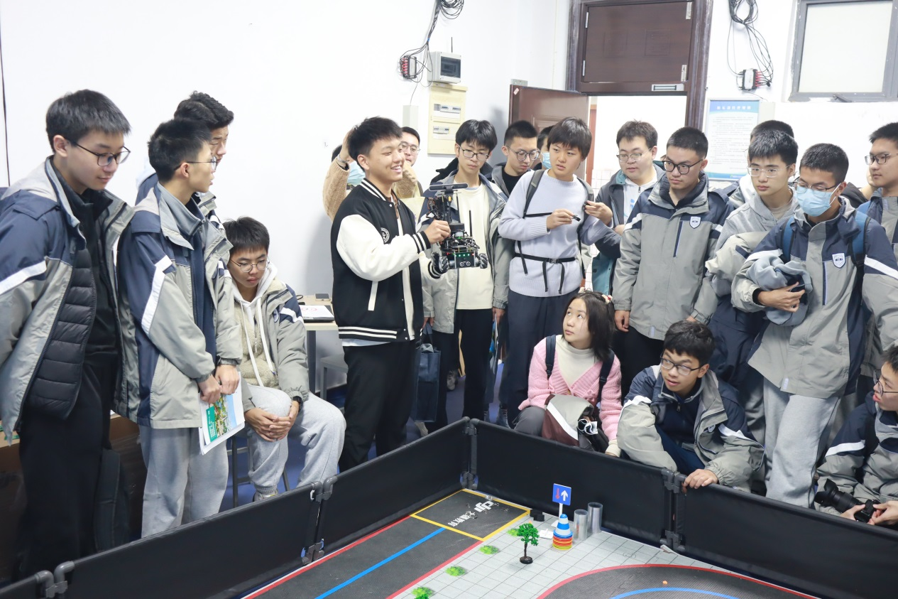在大学生创新实践基地党支部党员的带领下,同学们沿途经过江南大学最高标志建筑公益图书馆,欣赏七曲桥边黑天鹅翩翩起舞,穿过曲径通幽的林间小路,来到“未来卓越工程师的摇篮”——物联网大学生创新实践基地。整个路途中,江南大学的秀美景色吸引了众多同学驻足停留,激起同学们对大学生活的憧憬和向往。在电子设计俱乐部,同学们依托讲解员的讲解和自身基础知识储备,认真了解面前数种功能电路的原理和组成,工程思维也在理论与实际的交汇中不断完善;在智能车俱乐部,同学们时而认真揣摩两轮车、独轮车等科创作品的工作原理,时而惊喜于作品实现的自主运行、自动避障等奇妙功能,他们不仅像海绵一样汲取知识,更能围绕其中的科学原理踊跃发言。科普研学基地为同学们提供了有趣的大疆智能车和飞行器的操作互动体验,物联网创新应用俱乐部的智慧河道项目更是帮助同学们树立了为人民谋福祉的科研初心。