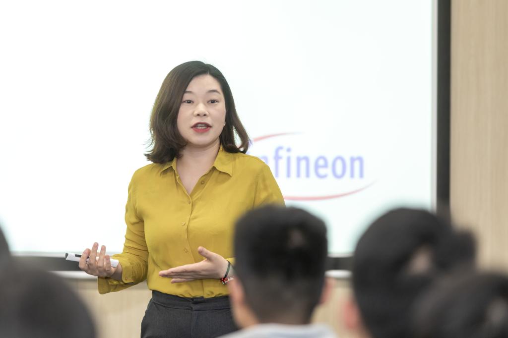 活动伊始,侯静首先对江南大学物联网工程学院师生一行表示热烈欢迎。随后,她围绕企业结构、业务领域、代表产品、企业文化等方面详细介绍了英飞凌科技(无锡)有限公司的基本情况。陈鎏从芯片制造基本流程、企业代表产品和中国半导体行业现状等方面为同学们介绍了半导体行业的现状,使同学们了解了中国半导体行业的发展形势,激励同学们要通过自身的奋斗和拼搏助力科技创新发展。