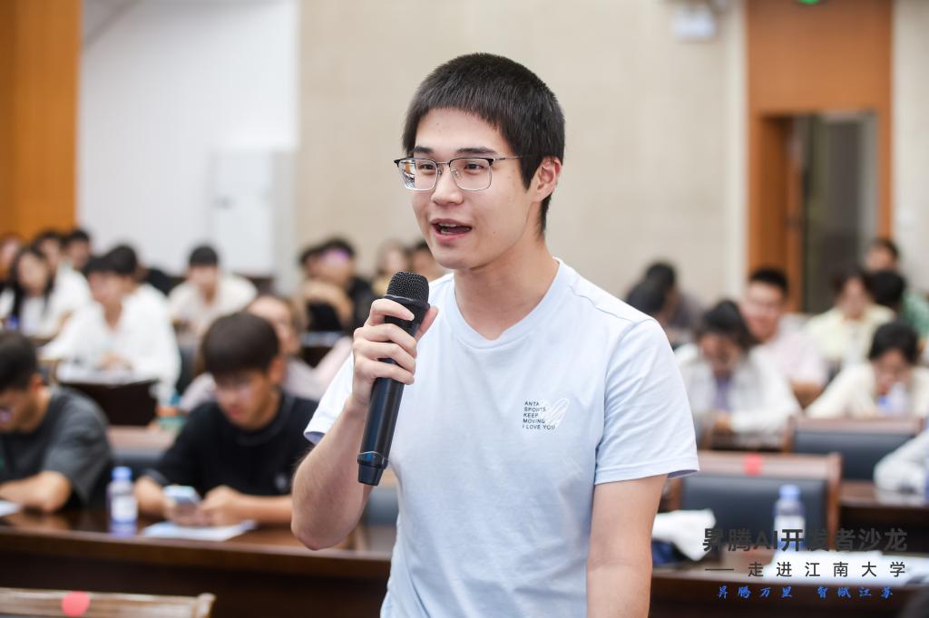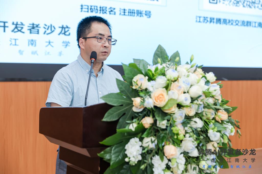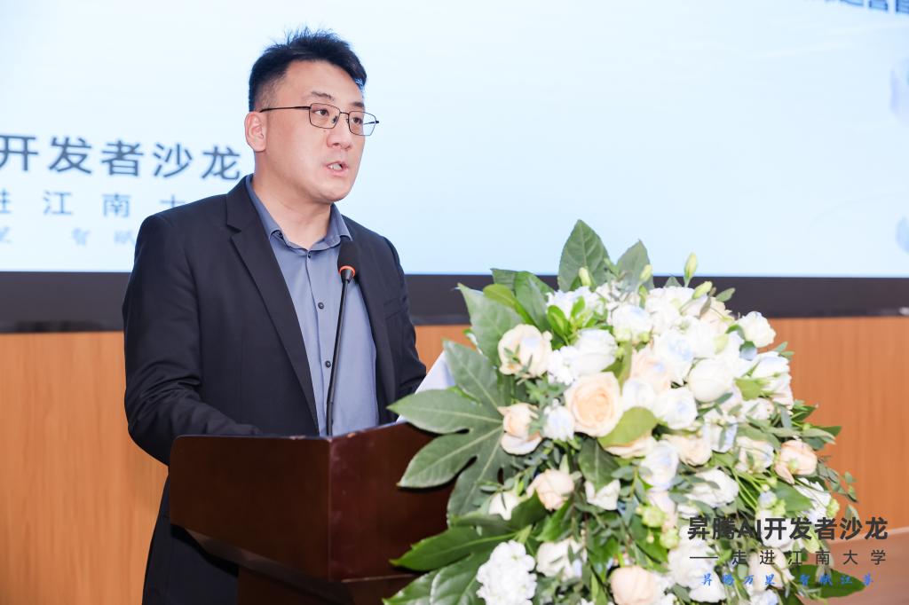 江南大学物联网工程学院教学副院长陶洪峰代表学校致欢迎词。陶院长指出华为昇腾作为人工智能领域的一颗璀璨明星,正以其强大的技术实力和创新能力,引领着行业的发展潮流。此次开发者沙龙的举办,为江南大学的广大师生提供一个和昇腾领域专家交流、合作、创新的平台,并结识更多致力于昇腾人工智能领域开发的朋友。陶院长鼓励大家携手共进,共同打造一个充满活力、创新无限的人工智能生态,一起探索人工智能的无限可能。