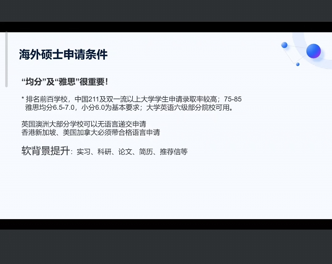 讲座中,吴老师首先剖析了海外读研的显著价值:在“学历通货膨胀”的大趋势下,未来硕士学历将愈发普遍,海外读研可提升学历竞争力;海外院校招生更注重综合能力,为本科背景一般的学生提供了冲击世界名校的机会。关于关键申请条件,吴老师指出,硬指标方面,世界前百强院校对中国211及双一流院校学生更青睐,录取率较高,通常要求均分75-85分,雅思6.5-7.0为基本要求,部分院校接受大学英语六级成绩;软实力方面,实习、科研、论文、高质量简历及推荐信等经历,可显著增强申请竞争力。