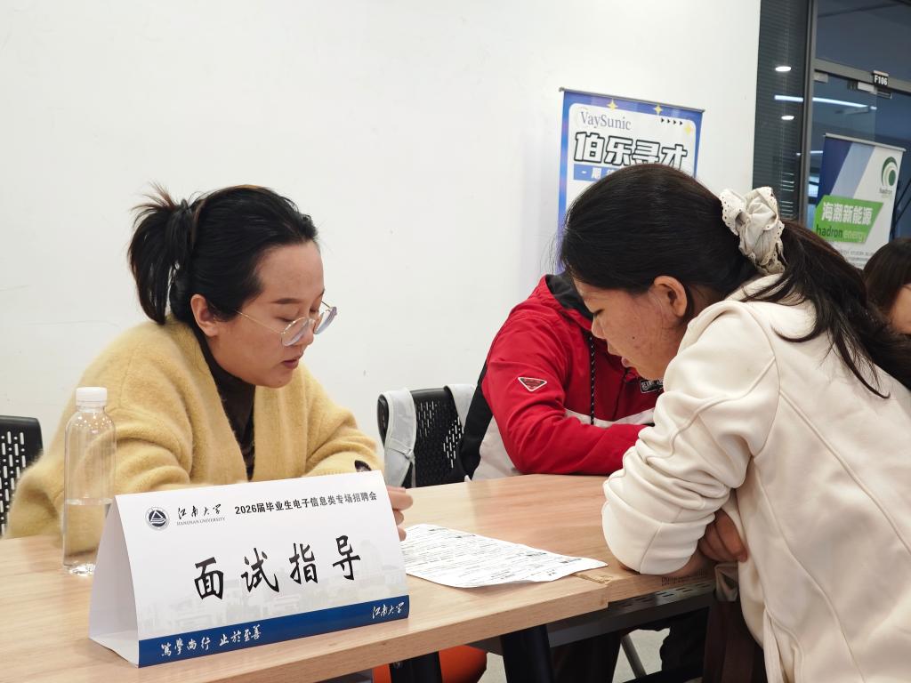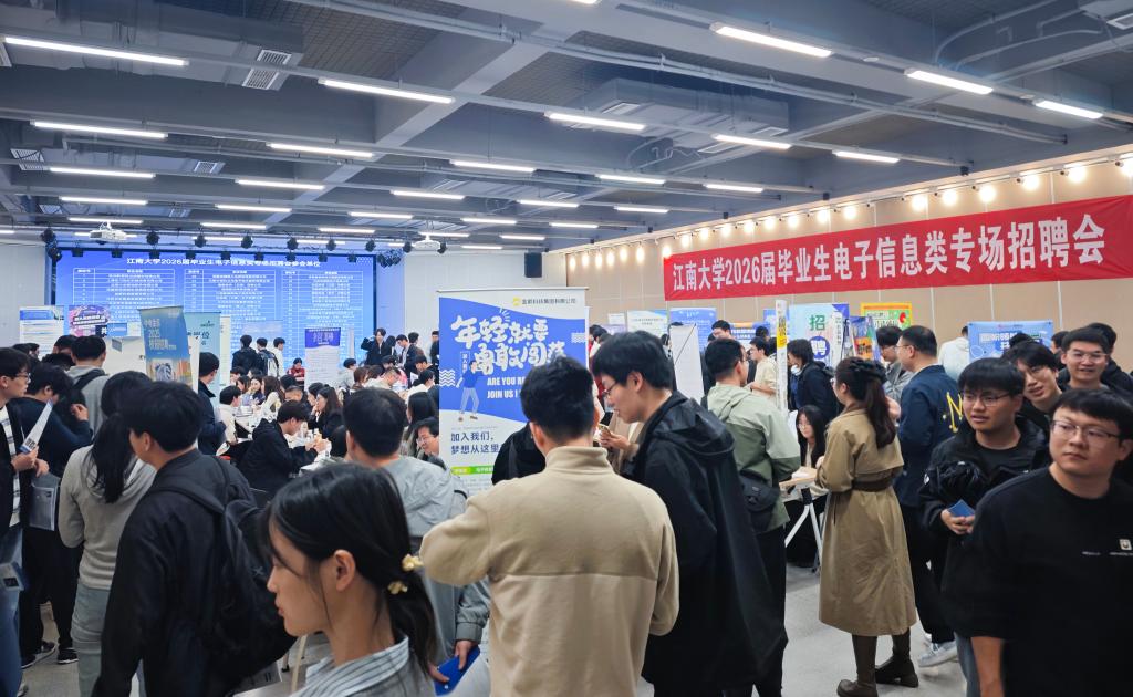 初冬蓄势扬帆起,蠡湖引航共筑梦。11月7日下午,江南大学2026届毕业生电子信息类专场校园招聘会在蠡湖校区北区大学生活动中心F105成功举办。本次招聘会由物联网工程学院、人工智能与计算机学院和集成电路学院联合举办,吸引了包括华为、小米、中国电子科技集团、长虹智能装备、村田电子、中天钢铁、苏南机场集团等66家知名企业、科研院所参与,涵盖物联网、自动控制、电气工程、人工智能、软件工程、集成电路等多个电子信息前沿领域,共提供优质岗位1800余个,吸引了近千名毕业生到场参与。