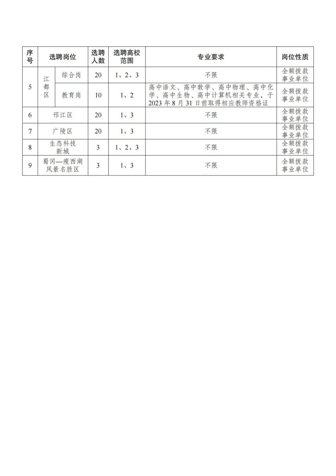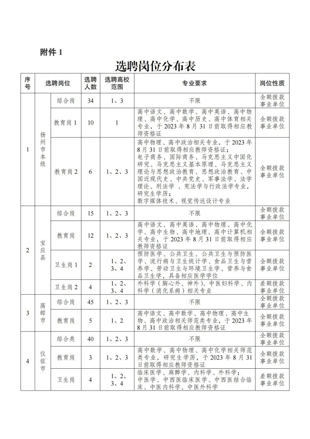 面向全国部分高校,选聘256名全日制大学本科及以上学历2023年应届优秀毕业生。其中:扬州市本级岗位50名,宝应县、高邮市、仪征市、江都区、邗江区、广陵区、生态科技新城、蜀冈—瘦西湖风景名胜区岗位206名。选聘对象不含委培、定向、专升本和独立学院毕业生。选聘岗位分布、选聘高校名单见附件。