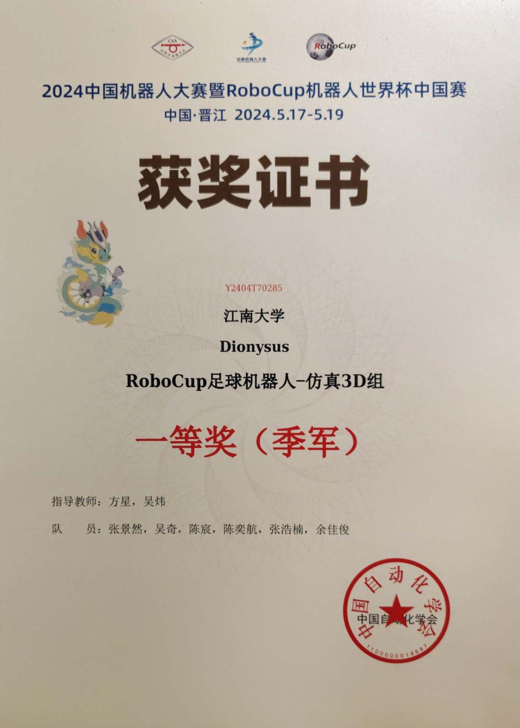 近日,2024中国机器人大赛暨RoboCup机器人世界杯中国赛在福建晋江市成功举办。江南大学物联网工程学院机器人俱乐部仿真3D足球队经过连续3天多轮激烈角逐,最终斩获全国一等奖(全国季军),打破了我校在该项赛事的历史最好成绩。