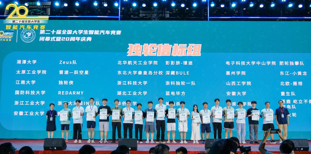 近日,第二十届全国大学生智能汽车竞赛全国总决赛在杭州电子科技大学落下帷幕。经过激烈角逐,物联网工程学院10支代表队的33名学子发挥出色,最终荣获全国一等奖2项、全国二等奖4项,取得历史性突破。其中,“独轮侠”队以全国第一名的成绩勇夺独轮信标组一等奖,刷新学校在该赛事中的最高纪录。首次参赛智慧配送创意组的“仓鼠快递”队表现同样亮眼,以全国第七名的成绩斩获一等奖。